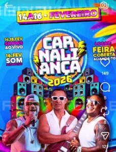 O tradicional carnaval de Aliança do Tocantins, o Carna Aliança 2026, acontecerá nos dias 14, 15 e 16 de fevereiro de 2026. Neste ano, o circuito da folia terá mudança de local: ao invés da Avenida Bernardo Sayão, o evento será realizado na Feira Coberta, que contará com toda a estrutura preparada para receber blocos e foliões com conforto e segurança.Entre as atrações já confirmadas está o prata da casa, cantor Jânio Bahia, que promete um show vibrante para animar o público, além de Rafa Souza, KAL SDQ. Segundo informações, empresários do Maranhão demonstraram interesse em levar o artista para uma turnê no carnaval daquele estado. No entanto, para a felicidade dos foliões aliancenses, Jânio Bahia confirmou presença no Carna Aliança 2026.