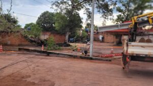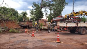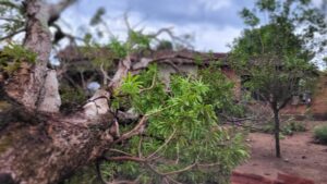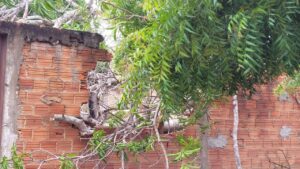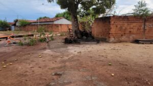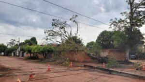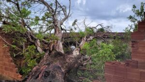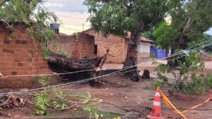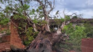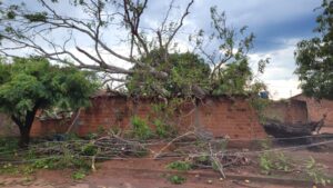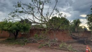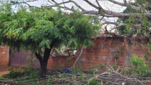Com o fornecimento de energia já normalizado, a árvore ainda permanece caída dentro do lote. Dona Marieta informou que entrou em contato com a prefeitura para solicitar apoio na retirada do tronco e limpeza da área .