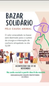 A Equipe Protetores de Aliança – Cães e Gatos realiza, no próximo dia 1º de novembro de 2025, a partir das 8h da manhã, um Bazar Solidário pela Causa Animal, na Sede Social de Aliança do Tocantins.